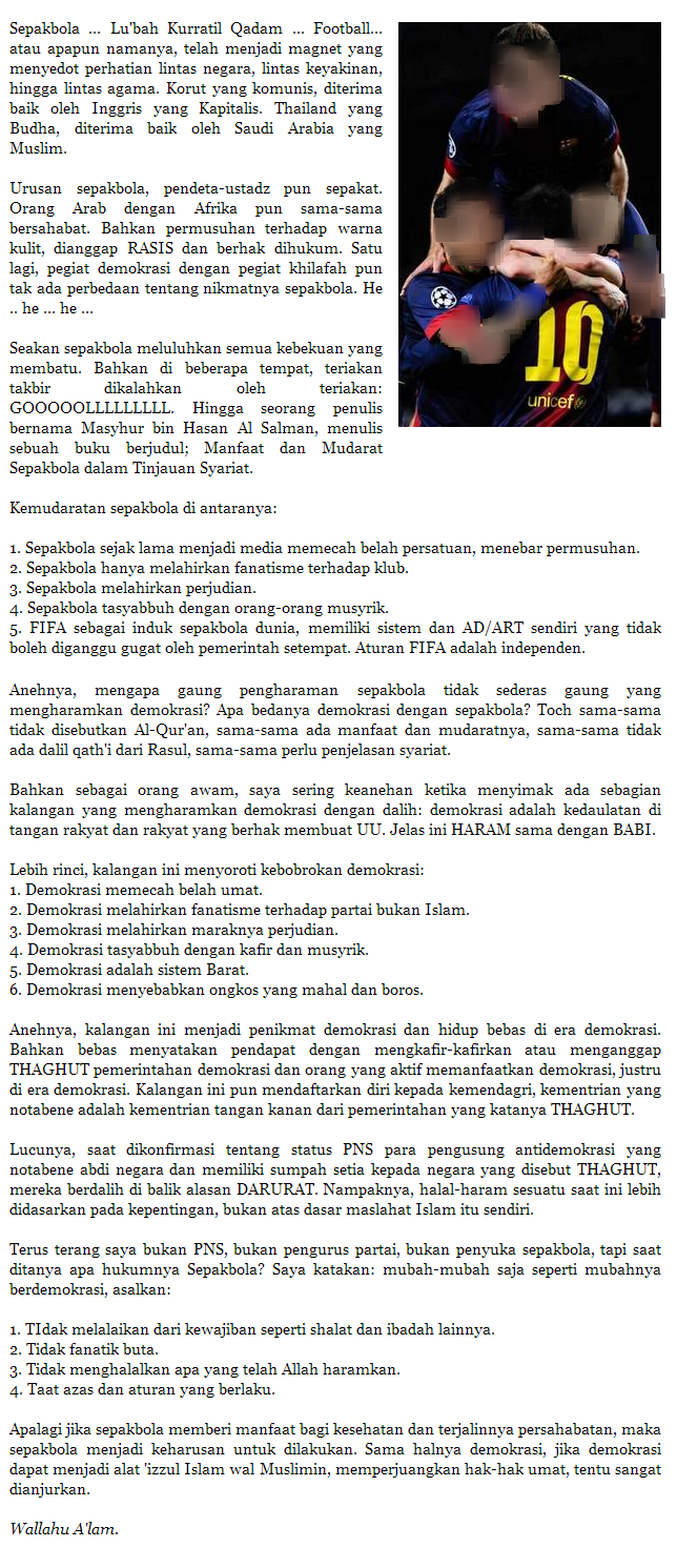 - Sistem demokrasi diharamkan karena didalamnya orang jahil, fasiq, musyrik, bisa ikut berpendapat menentukan baik-buruk. Apakah hal ini terdapat dalam permainan sepakbola? Tidak.